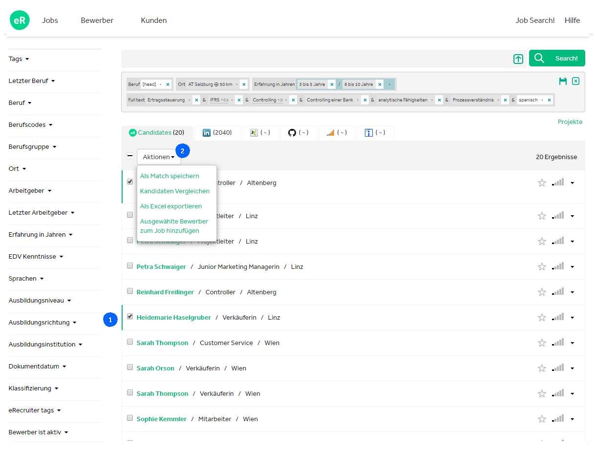 Bewerber können über das Aktionsmenü als Match gespeichert, als Excel exportiert und Jobs hinzugefügt werden. Wenn mehr als ein Kandidat auswählt wurde, gibt es auch die Möglichkeit diese zu vergleichen.