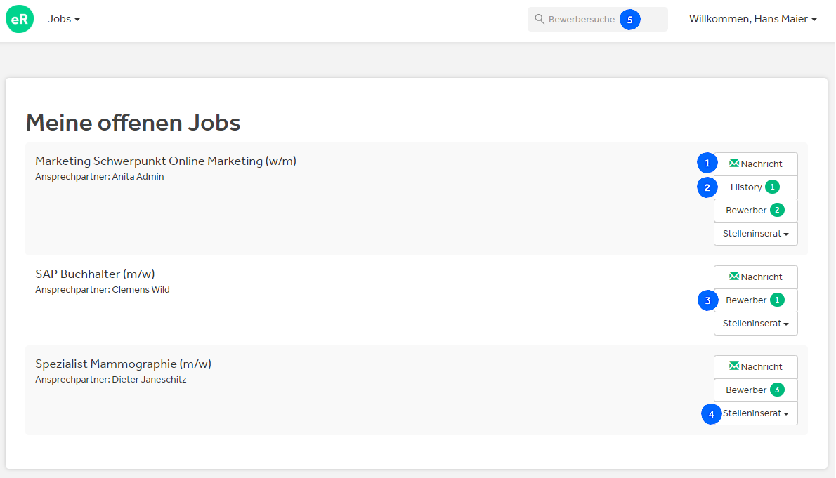 In der Bewerberübersicht sieht man alle von der Personalabteilung weitergeleiteten Bewerber eines Jobs im Detail. Es werden die zum jeweiligen Bewerber gehörigen Dokumente zum Download angeboten (abhängig davon, welche Dokumente in den Einstellungen im eRecruiter freigegeben werden). Je nach Status, in dem sich der Bewerber befindet, können verschiedene Aktionen ausgeführt werden (z.B. Absagen, Bewerber einladen).